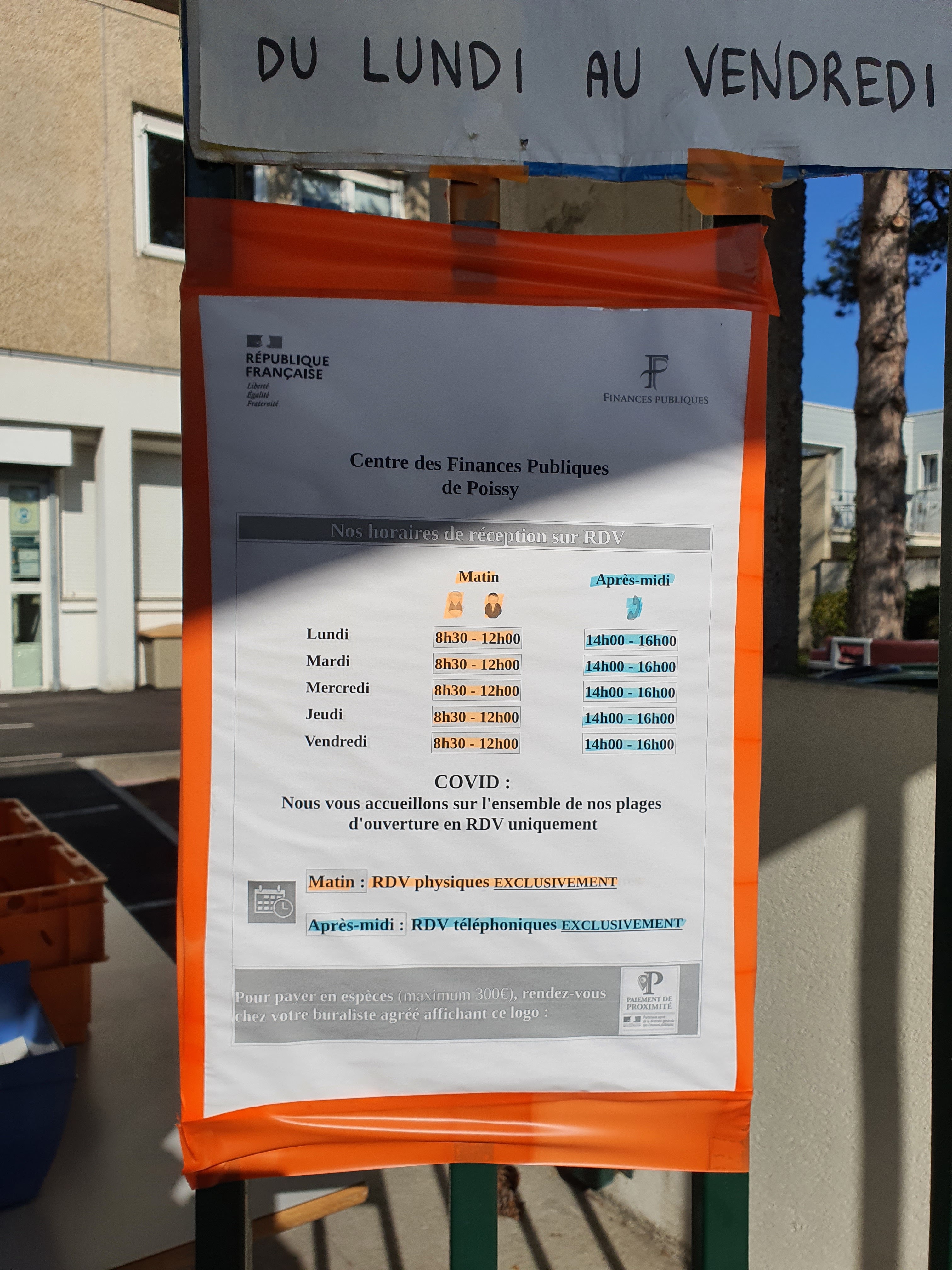 A partir du lundi 24 août 2020 le Centre des Finances Publique de Poissy est ouvert uniquement le matin à l'acceuil du public.L'après-midi sur rendez-vous uniquement. Vous pouvez prendre les rendez-vous téléphonique et accueil sur votre espace en ligne directement : -via votre compte particulier rubrique Mes contacts ou indirectement via la messagerie sécurisée ou l'adresse mail [email protected]